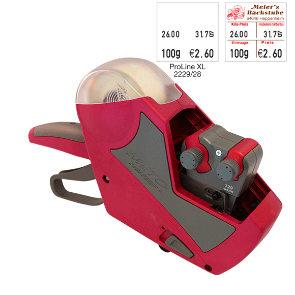 Ein- bis dreizeilige Auszeichner mit 7 - 36 Druckziffern. Maximale Drucktypenhöhe modellabhängig 8.3 mm zur Preisauszeichnung, Codierung, Auszeichnung nach Lebensmittelrecht oder für Etiketten mit Werbebotschaften (Merchandising-Etiketten). Etikettenformat: 29 x 28 mm, 29 x 32 mm. Auch als reines Spendgerät (ohne Druckwerk) für vorgedruckte Etiketten oder Auszeichner für elektromagnetische und radiofrequente Warensicherungsetiketten erhältlich.